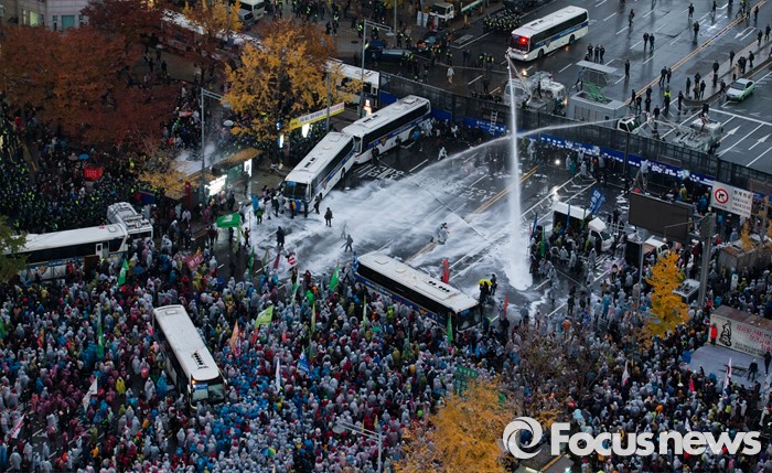한편 배씨는 민중총궐기뿐 아니라 지난해 4월 열린 세월호 범국민추모행동, 5월에는 세계 노동절대회 집회, 9월 민주노총 결의대회 집회 등에 참가해 교통을 방해한 혐의도 받고 있다.지난해 11월 14일 오후 서울 종로구 세종대로에서 열린 정부 규탄 '민중총궐기 투쟁대회'에서 경찰이 시위대를 향해 물대포를 쏘고 있다. 오장환 기자