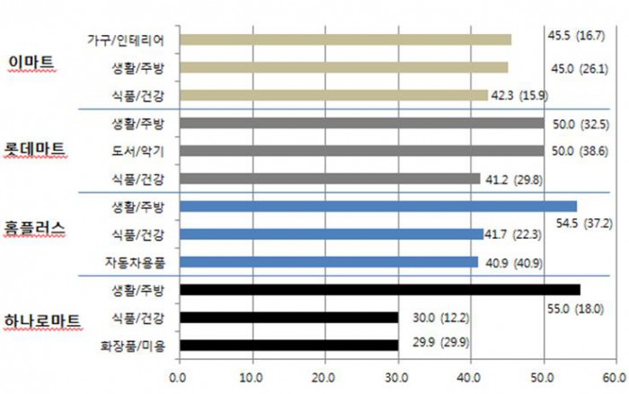 대형마트별 최고마진율(평균마진율)을 보면, 이마트 45.5%(18.2%), 롯데마트 50.0%(33.3%), 홈플러스 54.5%(27.8%), 농협 하나로마트 55.0%(11.9%)였다. 더욱이 이마트의 경우엔 업체에 별도의 물류비 분담율을 5% 이상 적용하고 있어 추가적인 판촉비, 판매장려금 등을 포함하면 납품업체들은 제품가격의 50% 이상을 지급해야 하는 것으로 확인됐다.