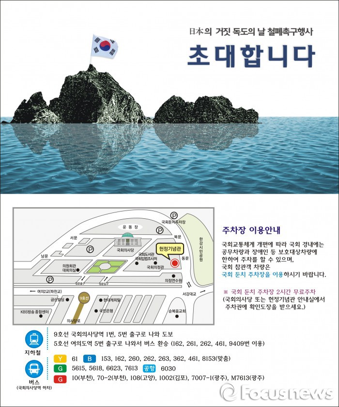 (서울=포커스뉴스) 독도사랑운동본부(총재대행 원용석)는 오는 22일 국회 헌정기념관에서 정관계 인사와 전국 학생대표 400여명이 참여하는 '일본 다케시마의 날 철폐촉구행사'를 개최한다.