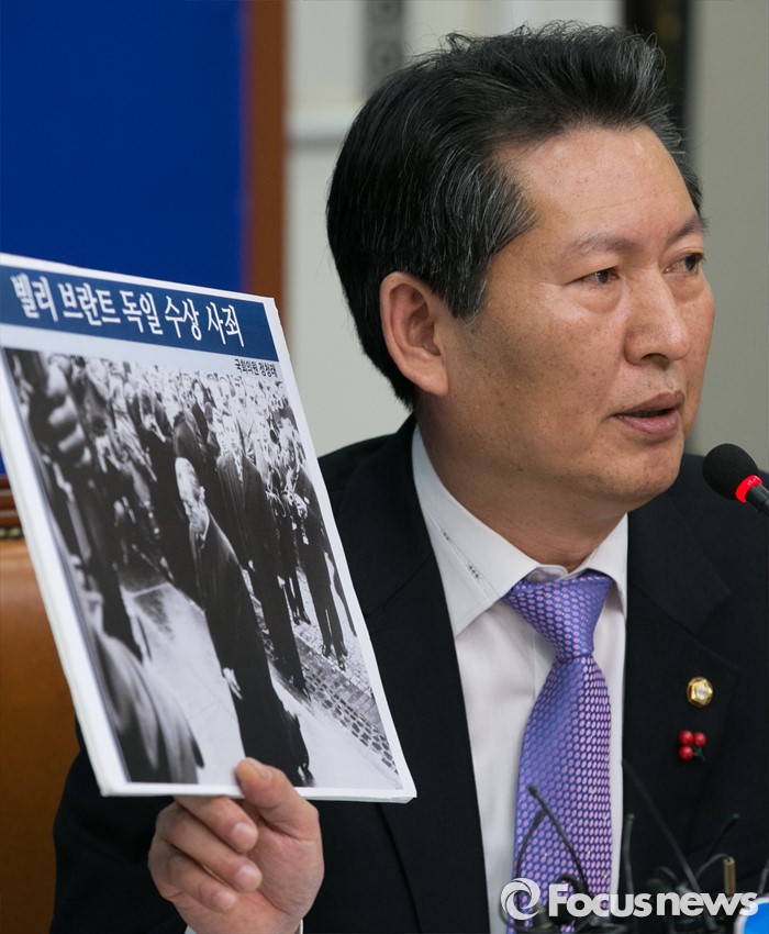 그는 “국가기관에 대한 명예훼손의 경우 성립 자체가 되지 않는 일인데 법률적으로 검토해봤다면 고발장 제출은 없었을 것”이라며 “이슈몰이를 하기 위한 정치적 쇼에 대응할 가치를 느끼지 못하고 있다”고 입장을 밝혔다.정청래 더불어민주당 최고위원이 지난해 12월 30일 오전 서울 여의도 국회에서 열린 더불어민주당 최고위원 회의에 참석해 빌리 브란트 독일 수상 사죄 사진을 들고 한일 위안부 협상과 관련 발언하고 있다. 박동욱 기자
