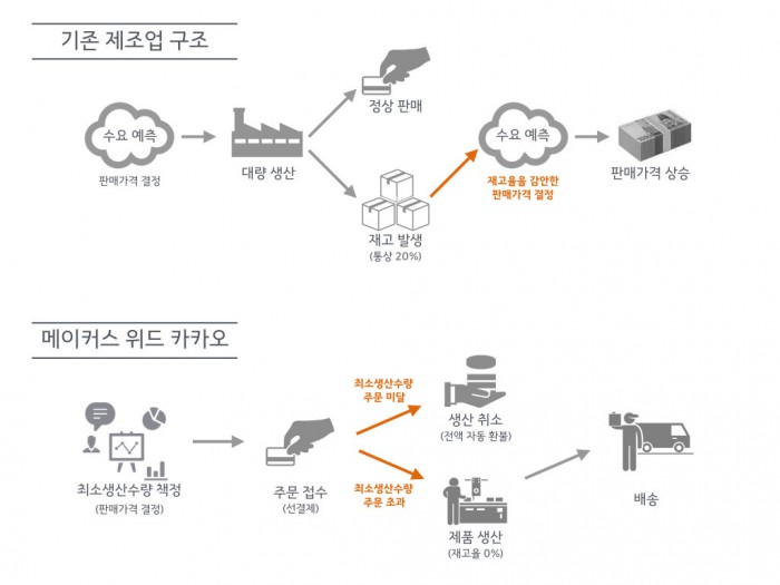 메이커스 위드 카카오는 카카오가 가진 모바일 경쟁력을 이용해 소비자와 생산자를 효율적으로 연결하는 서비스다. 4800만명의 카카오톡 이용자 기반으로 제조회사가 먼저 샘플을 보여주고 이용자들의 주문을 받아 생산하게 된다. 이윤을 만들 수 있는 최소생산수량(Minimum Order Quantity·MOQ) 이상의 주문 건에 대해서만 생산에 들어감으로써 평균 약 20% 수준에 이르는 재고물량을 없앤다. 소비자는 재고비용이 제거된 가격으로 가치있는 상품들을 구매할 수 있다.