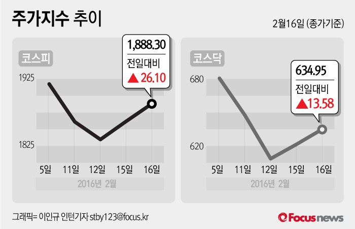 임채수 KR선물 연구원은 “유가와 중국증시 상승으로 주가가 상승했다”며 “금융통화위원회의 금리인하 소수의견이 나오면서 기준금리 인하 기대감까지 이어졌다”고 설명했다.(서울=포커스뉴스) 16일 코스피지수는 전날 보다 1.40%(26.10포인트) 오른 1888.30에 장을 마쳤다. 코스닥지수는 전일 대비 2.19%(13.58포인트) 오른 634.95에 마감했다. 2016.02.16 이인규 인턴기자
