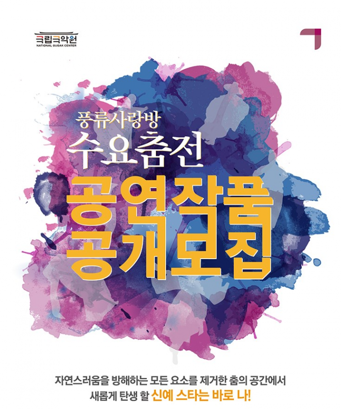지난해 첫 선을 보인 '수요춤전'은 국립국악원의 풍류사랑방에서 매주 수요일 저녁 8시에 선보이는 전통 춤 공연이다. 연간 평균 객석 점유율 97.7%를 보이며 뜨거운 관심을 받은 바 있다.풍류사랑방 '수요춤전' 공연작품 공개 모집 포스터.<사진제공=국립국악원>