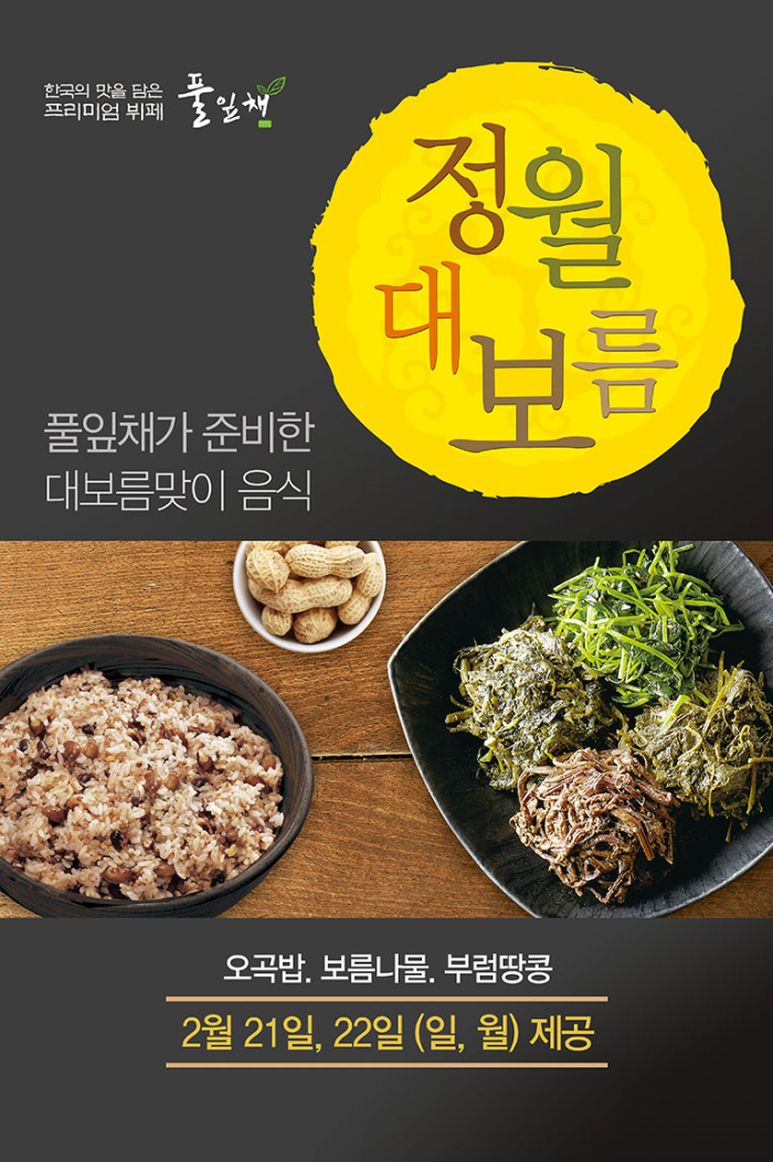 풀잎채에서는 건강한 2016년을 기원하기 위해 오곡밥과 기존에 제공하던 고사리, 취나물, 시래기 등의 산들나물과 함께 향긋한 깻잎나물을 준비했다. 또한 정월대보름에 빠질 수 없는 부럼 메뉴인 땅콩도 제공한다.(단, 메뉴는 매장에 따라 일부 상이할 수 있음)정월대보름 맞이 한정메뉴 출시 포스터.<사진제공=풀잎채>