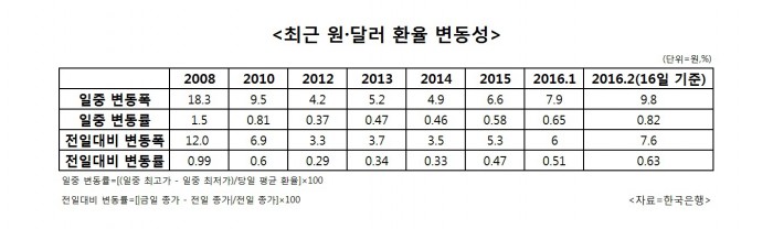 2월 16일까지의 원·달러 환율 일중 변동폭은 9.8원이며 변동률은 0.82%를 나타냈다. 전일대비 변동폭도 7.6원, 변동률은 0.63%로 집계됐다. 이는 글로벌 금융위기(2008년) 이후였던 2010년과 비슷한 수준이다. 2010년 원·달러 환율의 일중 변동폭은 9.8원, 변동률은 0.82%, 전일대비 변동폭(7.6원) 변동률(0.63%)로 나타났다.