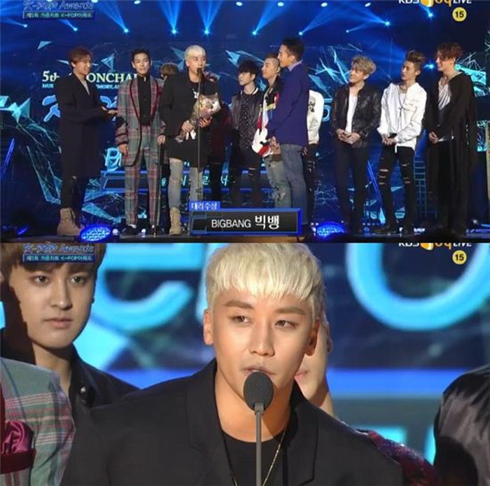 빅뱅 멤버들은 수상을 위해 수차례 무대에 올라 돌아가며 수상 소감을 전했다. 그중 멤버 승리는 재치있는 수상 소감으로 시상식에 유쾌함을 더했다.