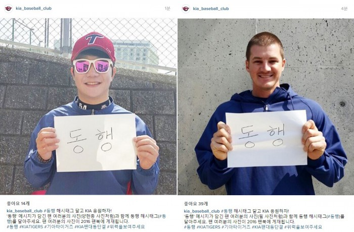 '동행' 해시태그 이벤트는 오는 29일까지 진행된다. 독창성이 돋보이는 참가팬에게 JBL스피커, 2016 스프링캠프 모자 등을 선물한다. 팬 인증사진을 모아 2016 KIA 팬북에 게재한다.프로야구 KIA가 '동행' 해시태그 이벤트를 연다. 사진은 구단 공식 인스타그램에 공개된 투수 양현종(왼쪽)과 외국인타자 필이 '동행' 메시지를 들고 포즈를 취하고 있는 모습. <사진제공=KIA 타이거즈>