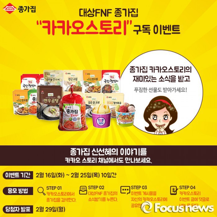 (서울=포커스뉴스) 대상FNF의 종가집은 소비자와 소통을 확대하기 위한 '카카오스토리 구독 이벤트'를 오는 25일까지 진행한다.
