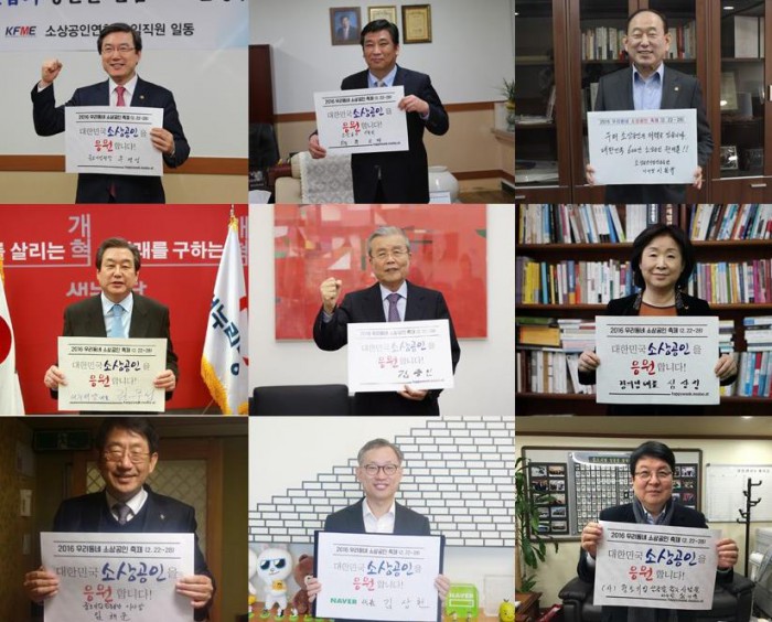이를 앞두고 소상공인연합회 최승재 회장과 중소기업청 주영섭 청장, 소상공인시장진흥공단 이일규 이사장, 더불어민주당 김종인 비상대책위원회 대표, 정의당 심상정 상임대표, 새누리당 이현재 의원, 더불어민주당 이원욱 의원, 새누리당 이정현 의원, 더불어민주당 전순옥 의원, 새누리당 정두언 의원, 새누리당 홍지만 의원, 국민의당 유성엽 의원, 새누리당 김명연 의원 등이 응원 메시지를 전달했다.