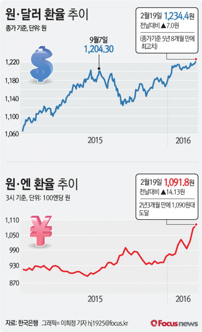 이밖에 중국인민은행이 일부 은행들에 대해 지급준비율 인상을 예고한 상태다. 은행 건전성 리스크에 대한 우려가 부각될 경우 원화 가치 하락 압력을 가할 수 있다.(서울=포커스뉴스) 19일 서울 외환시장에서 원·달러 환율은 전 거래일 대비 7.0원 상승(원화 가치 하락)한 1234.4원에 마무리됐다. 이는 2010년 6월 11일 종가 1246.1원 뒤 5년 8개월 만에 최고 수준이다. 원·엔 환율은 3시 기준 1091.8원을 기록해 2년3개원만에 1090원대에 도달했다. 2016.02.19 조숙빈 기자