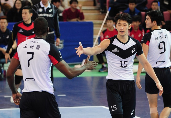현대캐피탈의 다채로운 공격루트도 돋보였다. 외국인선수 오레올(13득점)에 의존하지 않고 문성민(14득점) 신영석(12득점) 박주형(8득점) 최민호(6득점) 등 고른 득점력으로 한국전력의 수비를 흔들었다. 매세트 승부처마다 나온 서브득점과 블로킹 득점으로 경기를 쉽게 풀어갔다. 반면 한국전력은 외국인선수 얀스토크(20득점)이 힘을 냈지만 상대적으로 전광인(11득점)과 서재덕(6득점)이 공격에 어려움을 겪으며 연승이 멈췄다.남자프로농구 현대캐피탈이 21일 한국전력을 꺾고 15연승을 달렸다. 문성민(오른쪽)과 외국인선수 오레올이 득점을 올린 뒤 서로를 격려하고 있다. <사진제공=프로배구연맹>