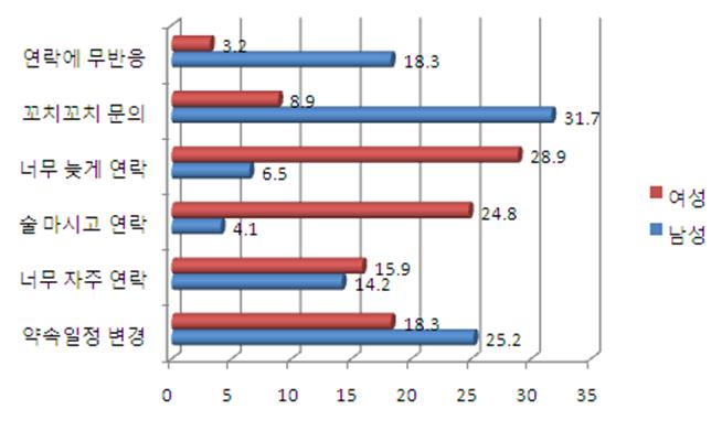 남성의 경우엔 '이것저것 꼬치꼬치 물을 때'(31.7%)가 가장 많았고, '약속일정을 바꿀 때'(25.2%), '연락해도 반응이 없을 때'(18.3%), '너무 자주 연락할 때'(14.2%) 등이 그 뒤를 이었다.