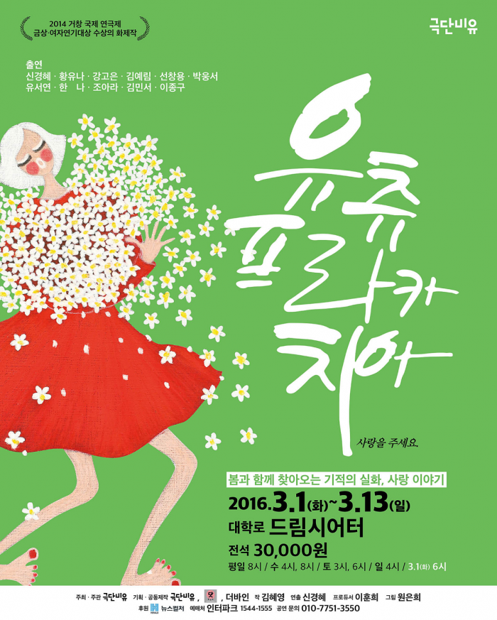 연극 '유추프라카치아'는 평일 8시, 수요일 4시, 8시, 토요일 3시, 6시에 공연이 진행되며 일요일은 4시다. 단, 3월1일 공연은 오후 6시가 첫 공연이다. 티켓 가격은 일반석 3만원, 고등학생 이하는 1만5000원이며 예매는 인터파크(www.interpark.com)와 대학로 티켓닷컴(대학로티켓.com) 그리고 인터파크 전화(1544-1555)를 통해 예매가 가능하다.창작극 '유츄프라카치아' 포스터.<사진제공=극단 비유>
