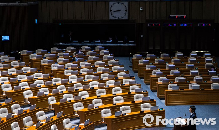 (서울=포커스뉴스) 23일 오후 서울 여의도 국회에서 테러방지법 직권상정을 막기 위해 야당의 '필리버스터' 가 시작된 가운데 텅 빈 본회의장에서 김광진 더불어민주당 의원이 발언을 하고 있다.