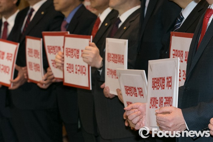 (서울=포커스뉴스) 23일 오후 서울 여의도 국회 로텐더홀에서 테러방지법과 관련한 야당의 필리버스터에 대해, 새누리당 의원들이 규탄성명 발표 전, 피켓을 들고 있다.