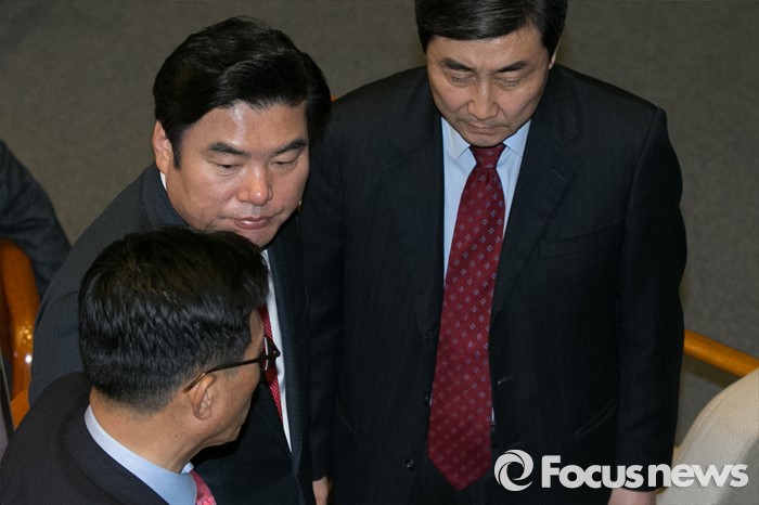 (서울=포커스뉴스) 원유철(가운데) 새누리당 원내대표가 23일 오후 서울 여의도 국회 본회의장에서 이종걸(오른쪽) 더불어민주당 원내대표와 대화하고 있다.