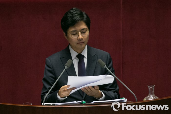 (서울=포커스뉴스) 김광진 더불어민주당 의원이 23일 오후 서울 여의도 국회 본회의장에서 테러방지법과 관련해, 무제한 토론을 하며 원고를 넘기고 있다.