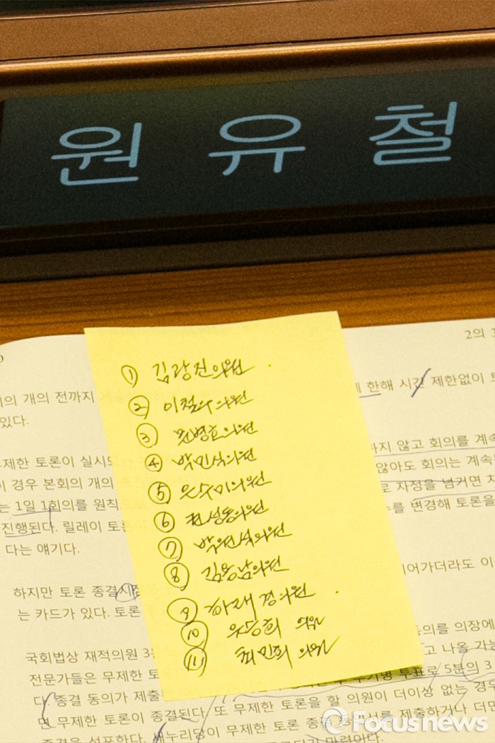(서울=포커스뉴스) 23일 오후 서울 여의도 국회 본회의장에서 테러방지법과 관련해 김광진 더민주 의원이 무제한 토론을 하는 동안, 원유철 새누리당 원내대표 자리에 무제한토론 명단이 놓여 있다.