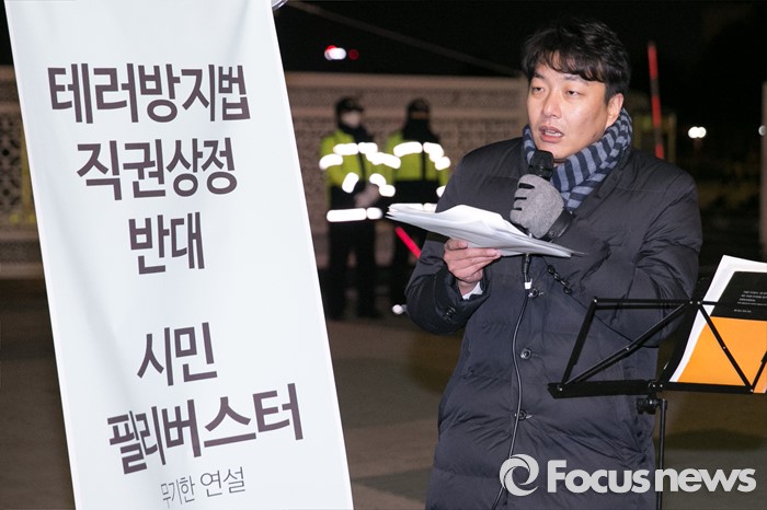(서울=포커스뉴스) 한 시민이 24일 오전 서울 여의도 국회 정문 앞에서 테러방지법 처리를 반대하는 시민 필리버스터에 참여해 연설을 하고 있다.