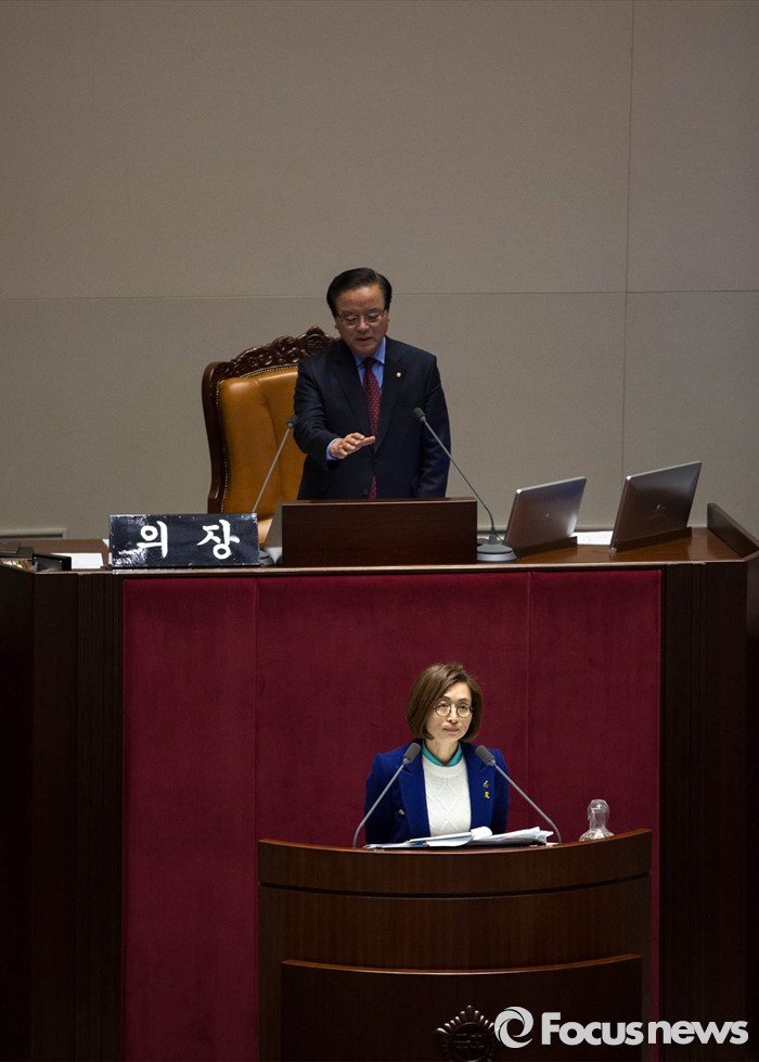 (서울=포커스뉴스) 은수미 더불어민주당 의원이 24일 오전 서울 여의도 국회 본회의장에서 대테러방지법 처리를 막기 위해 필리버스터를 하는 동안 정갑윤 국회부의장이 연설 주제에 대해 지적하고 있다.