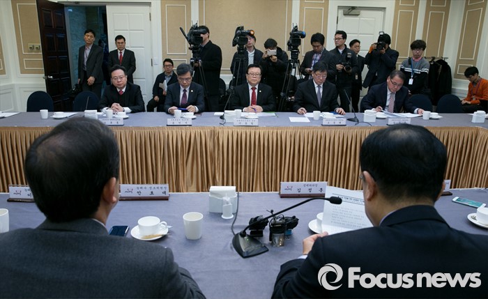 (서울=포커스뉴스) 24일 오전 서울 여의도 국회 귀빈식당에서 열린 쌀 수급 안정을 위한 당정협의에 참석한 이동필 농림축산식품부 장관 등 정부부처 참석자들이 김정훈 새누리당 정책위의장의 모두발언을 듣고 있다.