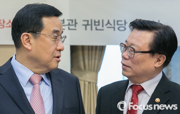 (서울=포커스뉴스) 24일 오전 서울 여의도 국회 귀빈식당에서 열린 쌀 수급 안정을 위한 당정협의에 앞서 이동필(오른쪽) 농림축산식품부 장관과 김정훈 새누리당 정책위의장이 대화하고 있다.