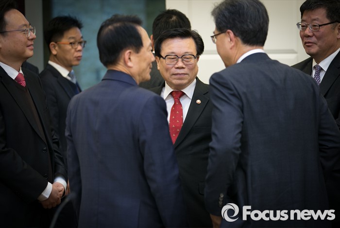 (서울=포커스뉴스) 24일 오전 서울 여의도 국회 귀빈식당에서 열린 쌀 수급 안정을 위한 당정협의에 앞서 이동필(가운데) 농림축산식품부 장관이 참석자들과 대화하고 있다.