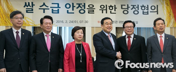 (서울=포커스뉴스) 24일 오전 서울 여의도 국회 귀빈식당에서 열린 쌀 수급 안정을 위한 당정협의에 앞서 새누리당 의원들과 정부부처 참석자들이 취재진을 향해 포즈를 취하고 있다. 왼쪽부터 송언석 기획재정부 2차관, 홍문표, 윤명희 의원, 김정훈 정책위의장, 이동필 농림축산식품부 장관, 안효대 의원.