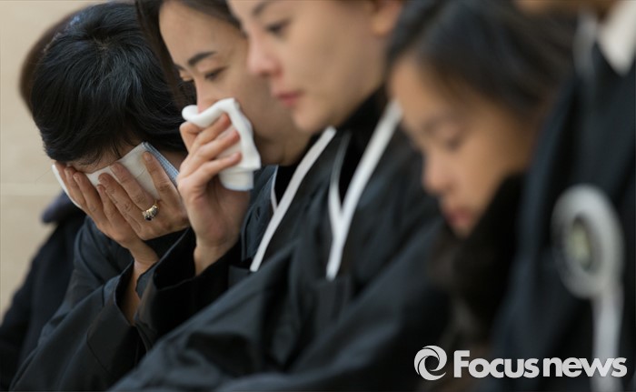 (서울=포커스뉴스) 24일 오전 서울 서초구 서울성모병원에서 故 이기택 전 민주당 총재의 발인 예배에 참석한 유가족들이 눈물을 흘리고 있다.