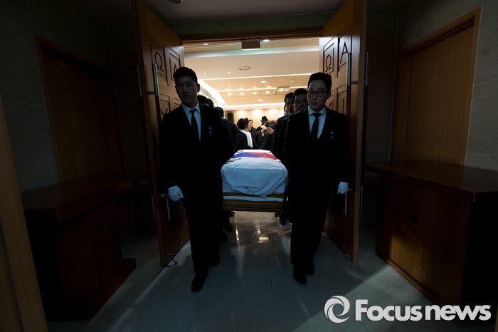 (서울=포커스뉴스) 24일 오전 서울 서초구 서울성모병원에서 故 이기택 전 민주당 총재의 발인식이 진행되고 있다.