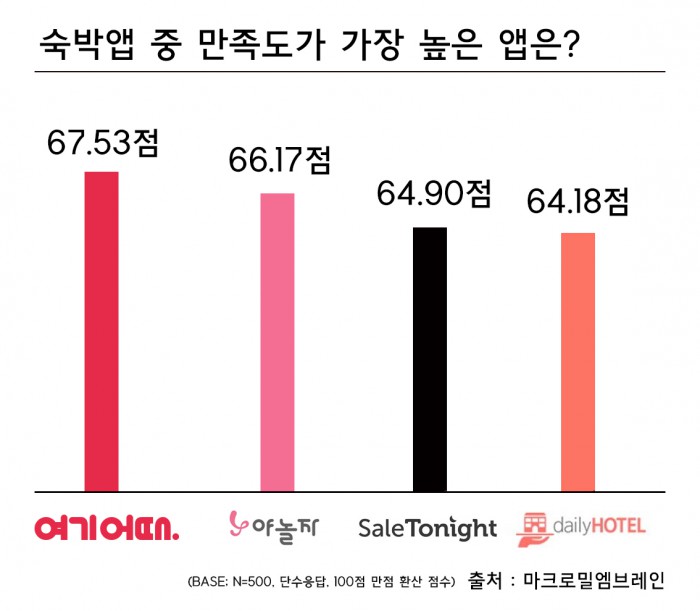 24일 시장조사전문기업 마크로밀엠브레인이 최근 전국 20~34세 숙박 앱 이용자 500명을 대상으로 만족도 조사를 진행한 결과에 따르면 서비스 이용 후 가장 만족했던 숙박 앱으로 위드이노베이션(이하 위드이노)의 중소형호텔 앱 여기어때가 1위(67.53점)에 꼽혔다. 2위는 야놀자(66.17점)가 차지했고, 세일투나잇(64.90)과 데일리호텔(64.18)이 뒤를 이었다.