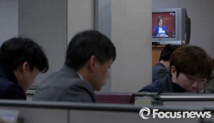 (서울=포커스뉴스) 24일 오전 서울 여의도 국회에서 테러방지법과 관련해 무제한 토론을 이어가고 있는 은수미 의원의 모습이 정론관에 중계되고 있다.