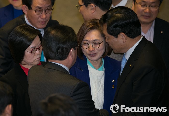 (서울=포커스뉴스) 테러방지법 직권상정에 반발해 야당의 무제한 토론(필리버스터)이 진행되고 있는 24일 오후 서울 여의도 국회 본회의장에서 토론을 마친 은수미 더불어민주당 의원이 동료 의원들의 격려를 받고 있다.