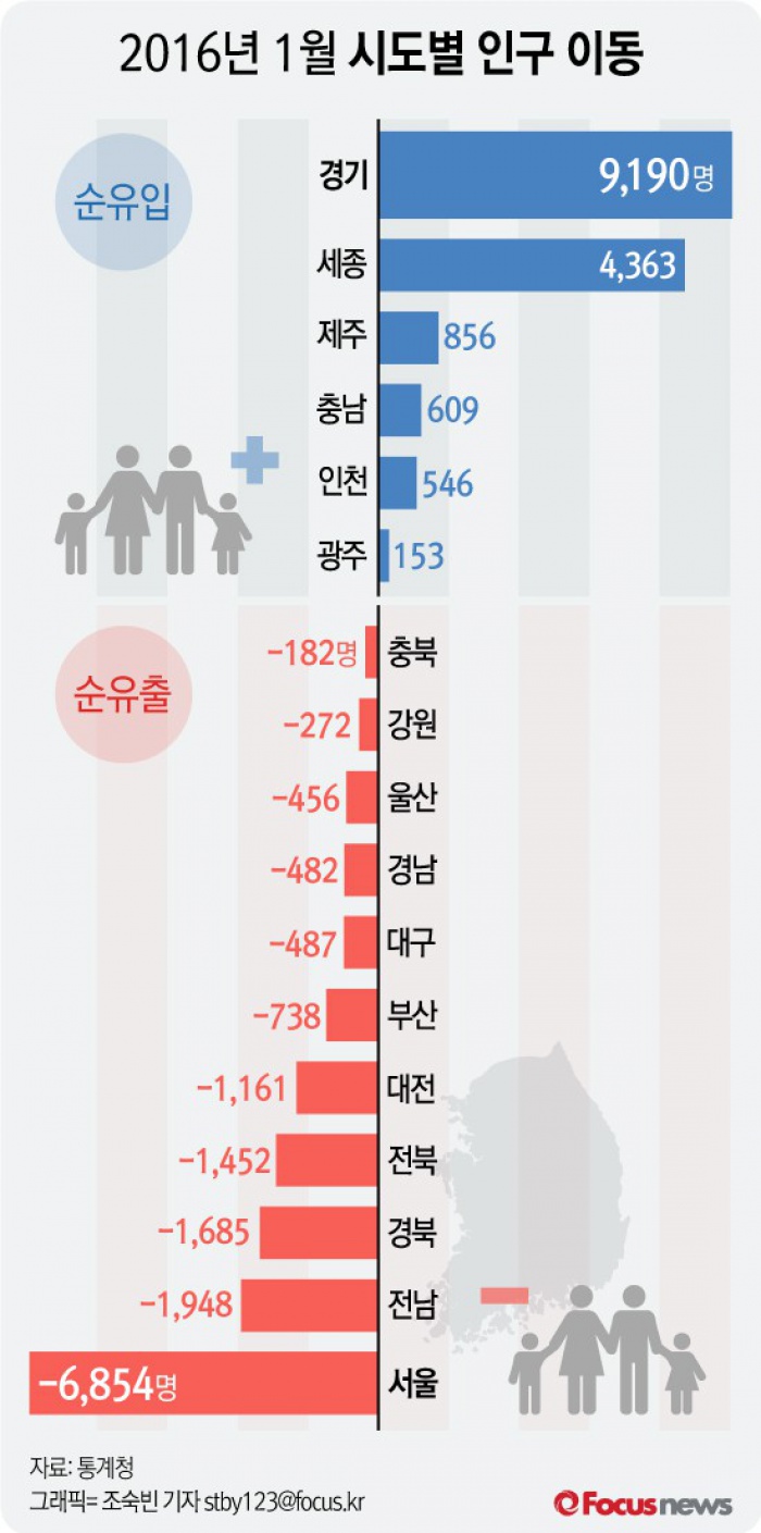 (서울=포커스뉴스) 24일 통계청은 '2016년 1월(1~31일) 시도별 인구 이동자 수'는 순유입자는 경기가 9,190명으로 가장 많고, 순유출자는 서울이 6,854명으로 가장 많았다고 발표했다.