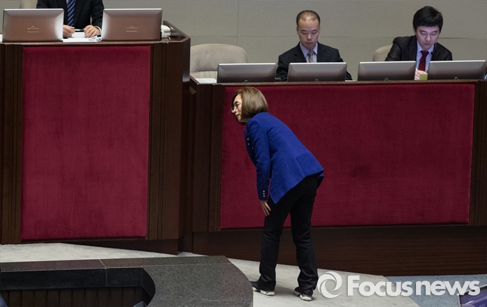 (서울=포커스뉴스) 테러방지법 직권상정에 반발해 야당의 무제한 토론(필리버스터)이 진행되고 있는 24일 오후 서울 여의도 국회 본회의장에서 토론에 참여한 은수미 더불어민주당 의원이 발언을 끝내고 퇴장하고 있다. 은 의원은 이날 10시간 18분의 토론을 기록해 국내 최장기록인 10시간 15분을 경신했다.