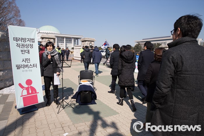 (서울=포커스뉴스) 24일 오후 서울 여의도 국회 정문 앞에서 테러방지법 처리를 반대하는 시민이 필리버스터에 참여해 연설을 하는 가운데 주위로 시민들이 지나가고 있다.