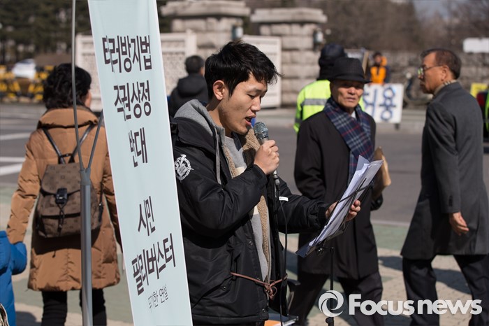 (서울=포커스뉴스) 24일 오후 서울 여의도 국회 정문 앞에서 테러방지법 처리를 반대하는 시민이 필리버스터에 참여해 연설을 하는 가운데 주위로 시민들이 지나가고 있다.