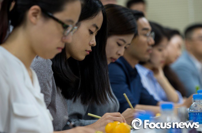 정부 관계자는 "임금피크제 절감재원이 실제 신규채용으로 연계돼 청년 일자리 창출에 기여할 수 있도록 기관별 채용실적을 주기적으로 점검하겠다"고 말했다.(서울=포커스뉴스) 지난해 8월 12일 오후 서울 마포구 백범로 서강대학교에서 열린 청년고용 간담회에 참석한 학생들이 황교안 국무총리의 모두발언을 메모하고 있다. 양지웅 기자