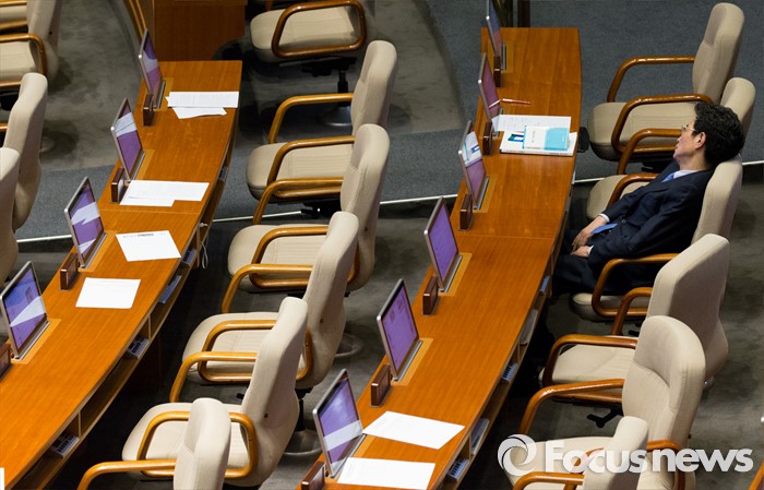 (서울=포커스뉴스) 테러방지법 직권상정에 반발해 야당의 무제한 토론(필리버스터)이 진행되고 있는 24일 오후 서울 여의도 국회 본회의장에서 이목희 더불어민주당 의원이 박원석 정의당의 발언을 듣다 졸고 있다.
