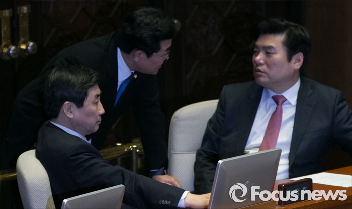 (서울=포커스뉴스) 테러방지법 직권상정에 반발해 야당의 무제한 토론(필리버스터)이 진행되고 있는 24일 오후 서울 여의도 국회 본회의장에서 원유철(오른쪽부터) 새누리당 원내대표, 전병헌 더불어민주당 의원, 이종걸 원내대표가 대화하고 있다.