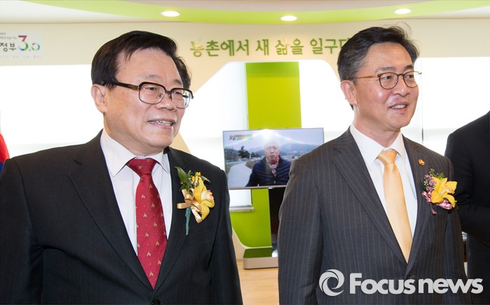 (안성=포커스뉴스) 24일 오후 경기 안성시 하나원에서 열린 하나원 농업·농촌 홍보관 개관식에서 이동필 농림축산식품부 장관과 홍용표 통일부 장관이 대화를 나누고 있다.