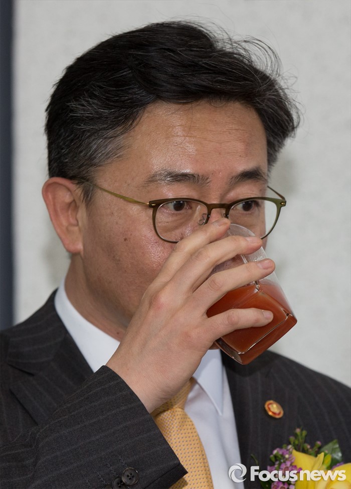 (안성=포커스뉴스) 24일 오후 경기 안성시 하나원에서 열린 하나원 농업·농촌 홍보관 개관식에서 홍용표 통일부 장관이 농촌 정착 북한 이탈주민이 생산한 주스를 마시고 있다.