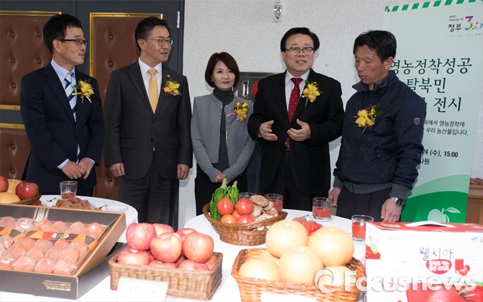 (안성=포커스뉴스) 24일 오후 경기 안성시 하나원에서 열린 하나원 농업·농촌 홍보관 개관식에서 이동필 농림축산식품부 장관과 홍용표 통일부 장관이 농촌 정착 북한 이탈주민들과 대화를 나누고 있다.