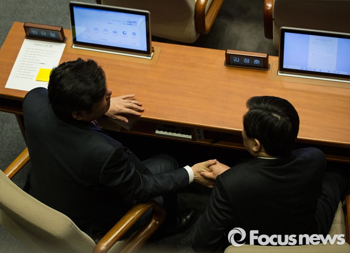 (서울=포커스뉴스) 박원석 정의당 의원이 24일 오후 서울 여의도 국회 본회의장에서 테러방지법의 본회의 의결을 막기 위한 필리버스터(무제한 토론을 통한 합법적 의사진행 방해)를 하고 있는 가운데 원유철(왼쪽) 새누리당 원내대표와 이종걸 더불어민주당 원내대표가 손을 잡고 있다.
