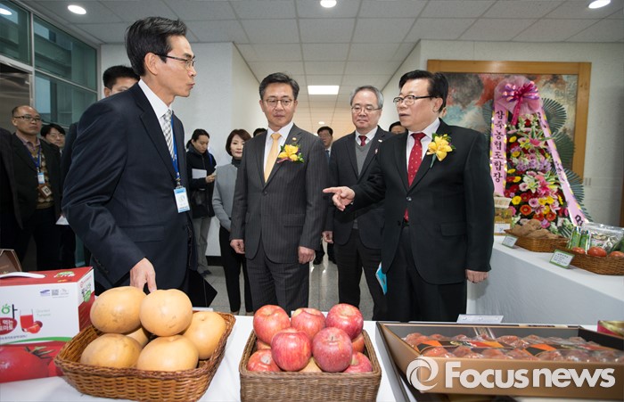 (안성=포커스뉴스) 24일 오후 경기 안성시 하나원에서 열린 하나원 농업·농촌 홍보관 개관식에서 이동필 농림축산식품부 장관과 홍용표 통일부 장관이 농촌 정착 북한 이탈주민들이 생산한 농산물을 둘러보고 있다.