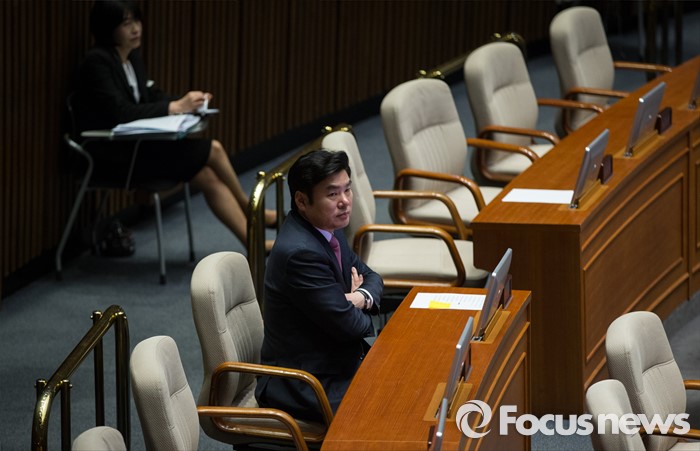 (서울=포커스뉴스) 박원석 정의당 의원이 24일 오후 서울 여의도 국회 본회의장에서 테러방지법의 본회의 의결을 막기 위한 필리버스터(무제한 토론을 통한 합법적 의사진행 방해)를 하고 있는 가운데 원유철 새누리당 원내대표가 앉아 있다.