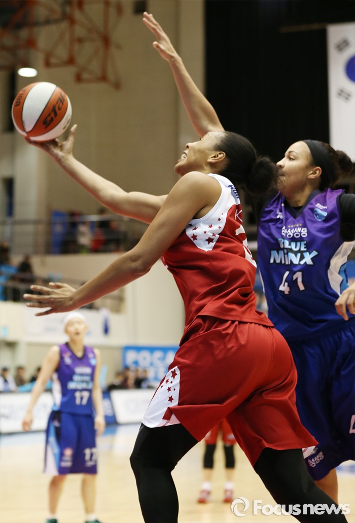 (구리=포커스뉴스) 24일 구리시체육관에서 열린 2015~2016 여자프로농구 KDB생명-삼성생명 경기에서 KDB생명 플레넷이 삼성생명 스톡스의 마크를 제치며 레이업슛을 시도하고 있다.
