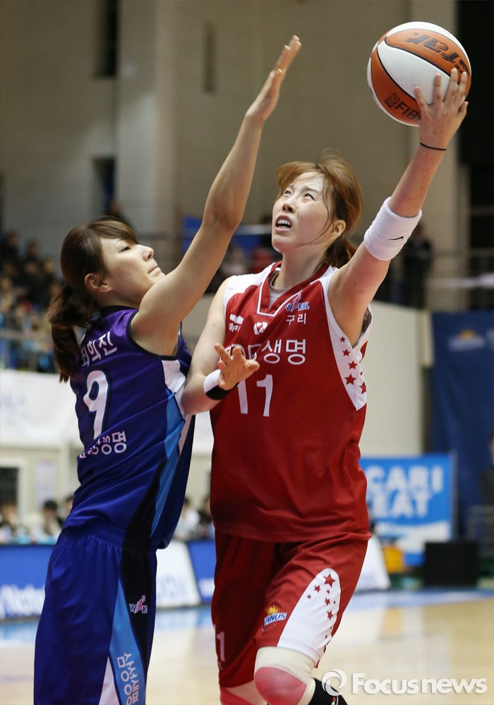 (구리=포커스뉴스) 24일 구리시체육관에서 열린 2015~2016 여자프로농구 KDB생명-삼성생명 경기에서 KDB생명 조은주가 삼성생명 최희진의 마크를 받으며 레이업슛을 쏘고 있다.