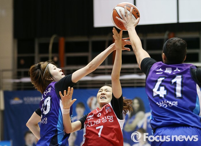 (구리=포커스뉴스) 24일 구리시체육관에서 열린 2015~2016 여자프로농구 KDB생명-삼성생명 경기에서 KDB생명 한채진의 슈팅을 삼성생명 스톡스가 블로킹하고 있다.