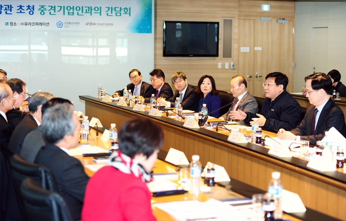 이날 간담회에는 강호갑 중견기업연합회 회장, 엄병윤 유라코퍼레이션 회장, 조시영 대창 회장, 김희용 동양물산기업 회장, 유태경 루멘스 대표, 김해련 송원그룹 회장, 최진식 SIMPAC 회장, 윤병은 아주산업 사장, 우오현 SM그룹 회장, 김재희 이화다이아몬드공업 사장, 정구용 인지컨트롤스 회장, 곽재선 KG그룹 회장, 방병일 한글과컴퓨터 부사장, 정영균 희림종합건축사사무소 대표, 반원익 중견기업연합회 부회장과 산업부 관계자 등 20여명이 참석했다. <사진제공=산업통상자원부>
